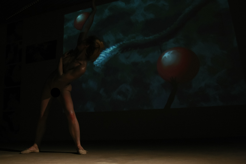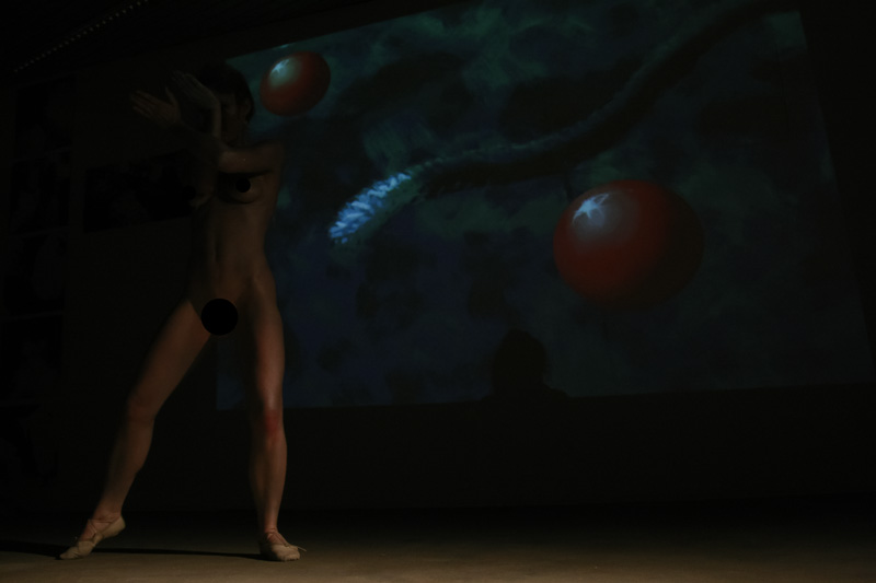 Leander Sukow und Muse Julietta Barrientos bringen eine besonders pornografische Auswahl Sukows Werke zum Vortrag. Die Bilder, die der Dichter im Kopf seiner Zuhörer entstehen lässt, setzen Smorlows projizierte Bilder in einen neuen Kontext – und umgekehrt.